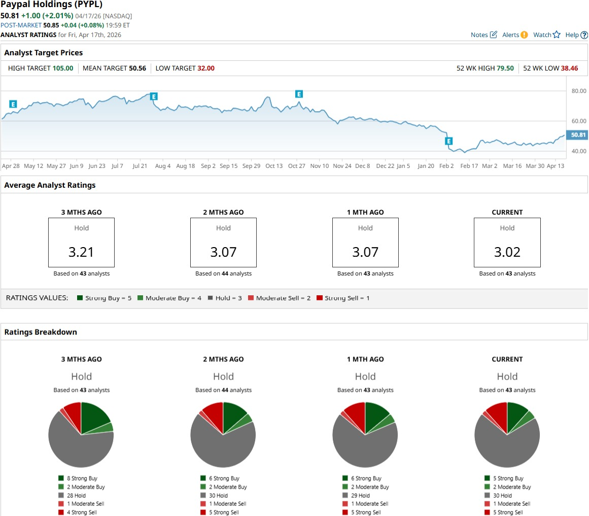 Analyst views reflect that caution, as 43 analysts rate PYPL stock as a consensus “Hold.” The average price target sits at $50.70, which is roughly in line with current prices. That tells the story clearly, as Wall Street is not betting on much upside unless something more concrete happens.