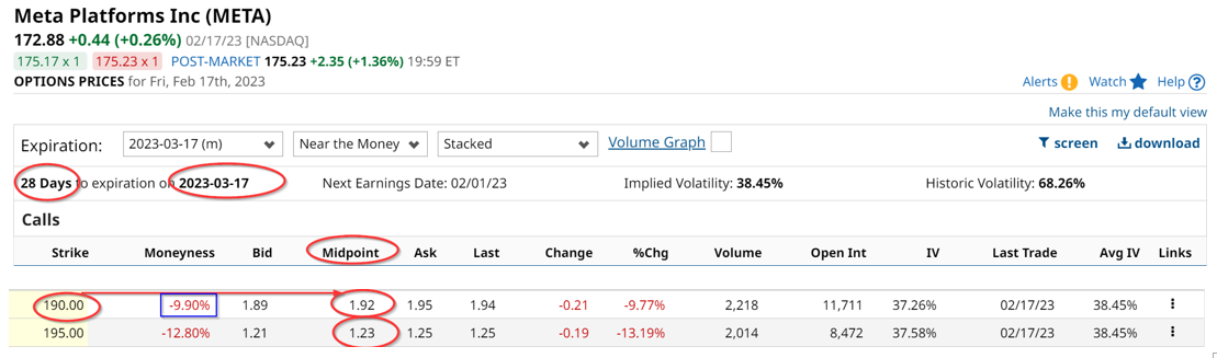 For example, March 17, 2023, calls at the $190 strike price trade for $1.92 per call option at the midprice. This means that the call option seller doesn't have to relinquish their META unless it rises over 9.9% higher at $190.00 on or before March 17.