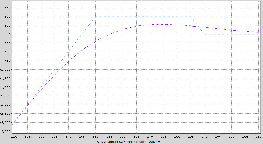 - If TGT is gets back into rally mode and is above 190, the bear call spread will suffer a full loss of $500, but this will be fully offset by the $500 premium received, leaving us in a no loss scenario (other than commissions).