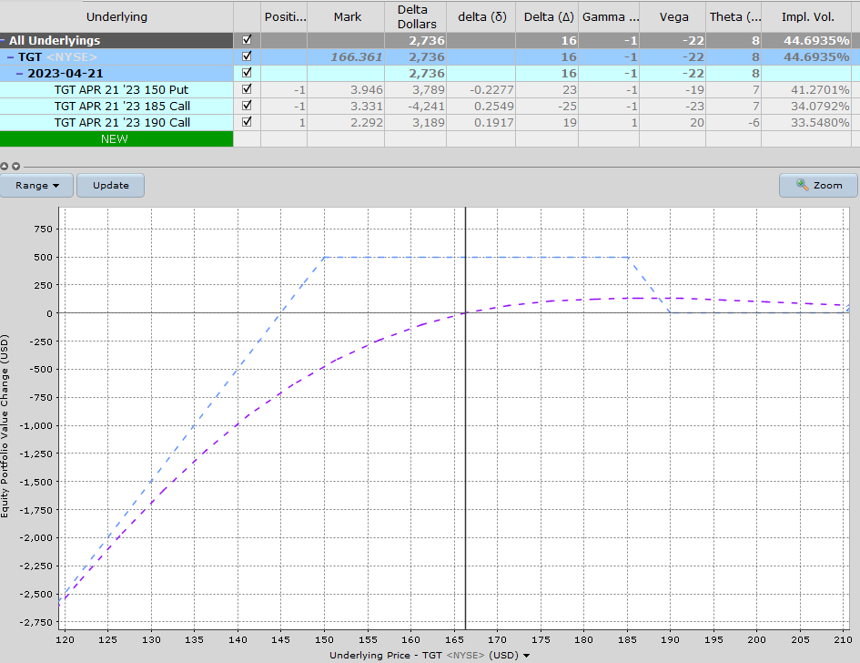 The position starts with a delta of 16, meaning it is roughly equivalent to owing 16 shares of TGT stock. This figure will change as the trade progresses.