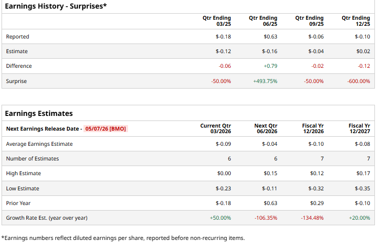 The company is scheduled to announce its fiscal Q1 earnings for 2026 before the market opens on Thursday, May 7. Ahead of this event, analysts expect this media and entertainment company to report a loss of $0.09 per share, down 50% from a loss of $0.18 per share in the year-ago quarter. The company has missed Wall Street’s bottom-line estimates in three of the last four quarters, while surpassing on another occasion.