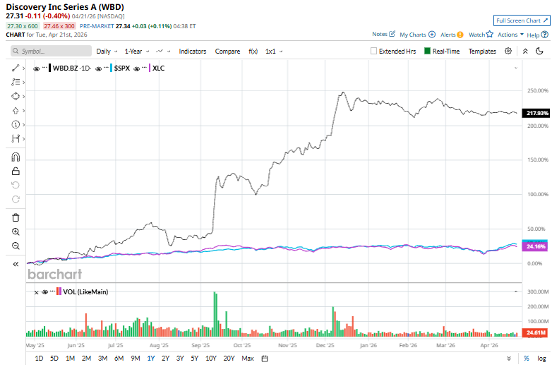 WBD has skyrocketed 244% over the past 52 weeks, significantly outperforming both the S&P 500 Index's ($SPX) 33.6% return and the State Street Communication Services Select Sector SPDR ETF’s (XLC) 32.9% uptick over the same time period.