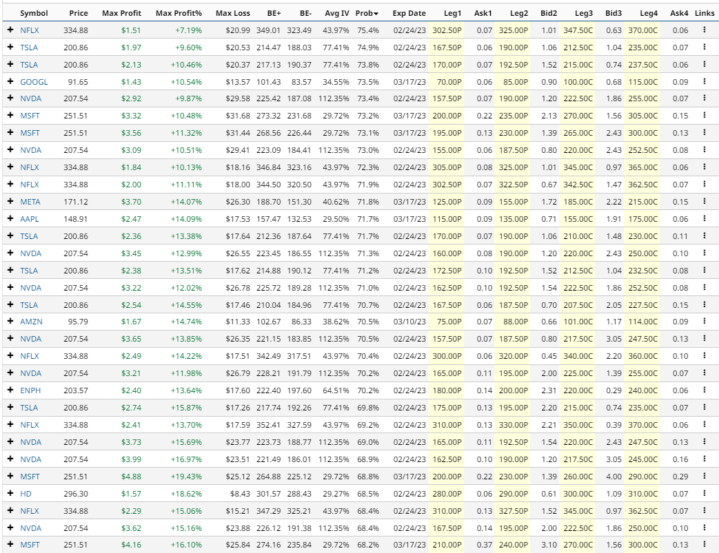 Let’s take a look at Barchart’s Short Iron Condor Screener for February 23rd: