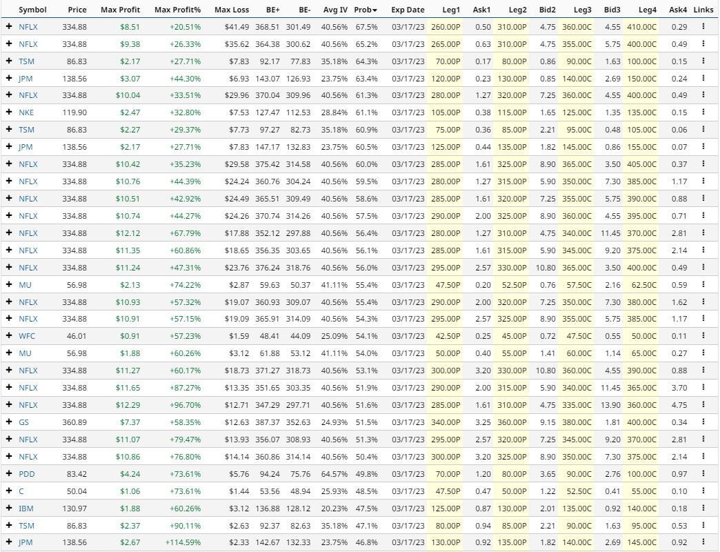 As you can see, the scanner shows some interesting Iron Condor trades on stocks such as NFLX, TSLA, GOOGL, NVDA, JPM, META and AAPL. Some of the results are very short-term trades and may not be suitable for all traders.Â
