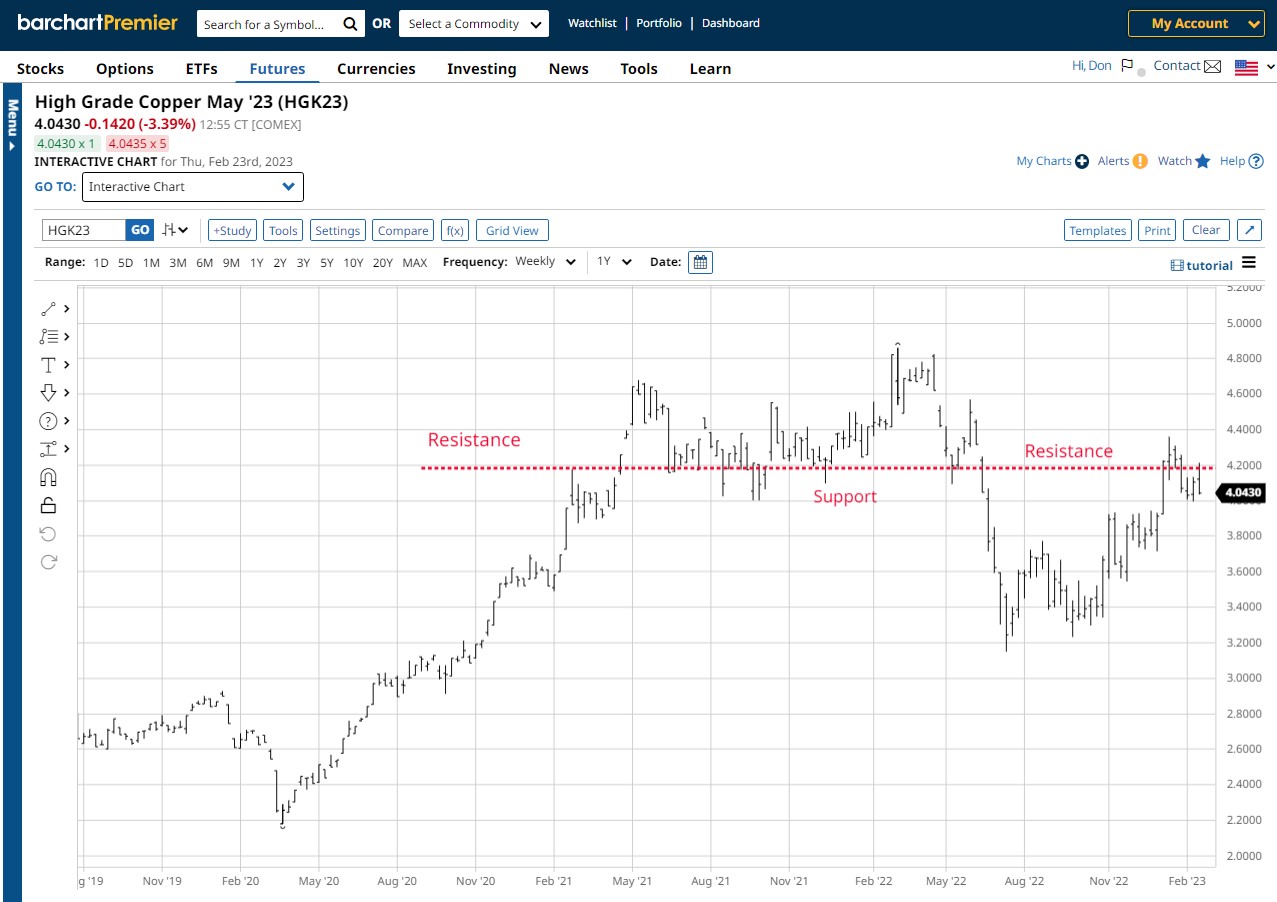Reviewing the weekly contract-specific chart of May copper, prices found supply at an area that has made copper prices go lower.Â