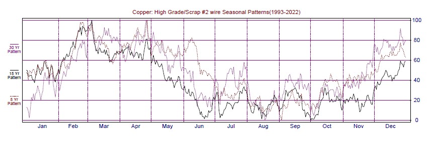 MRCIs research has revealed that copper usually has a price rally from a seasonal low in October-November as the building supplies and homebuilders prepare for the upcoming spring homebuilding season. Reviewing the MRCIs seasonal pattern for copper prices, we notice that the high prices for the past 15 years have arrived in February-March. Possibly due to the new demand for copper in electric vehicles (EVs), the 5 and 30-year pattern indicates a new high in April-May has been occurring, leading to a possible change in the seasonal pattern in the future. Another factor impacting the seasonal pattern was the robust housing market for the past two years. Due to the extensive demand, suppliers and home builders needed more copper than expected as new home orders came in.Â