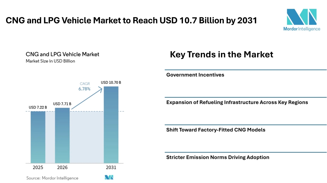 According to Mordor Intelligence, the CNG and LPG vehicle market size is estimated at USD 7.71 billion in 2026, rising from USD 7.22 billion in 2025, and is projected to reach USD 10.7 billion by 2031, growing at a CAGR of 6.78% during the forecast period. The market continues to gain steady traction as governments and fleet operators look for cost-effective and cleaner mobility options.