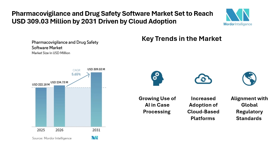 According to Mordor Intelligence, the pharmacovigilance and drug safety software market size in 2026 is estimated at USD 234.73 million, growing from USD 222.18 million in 2025 and projected to reach USD 309.03 million by 2031, registering a CAGR of 5.65% during the forecast period.