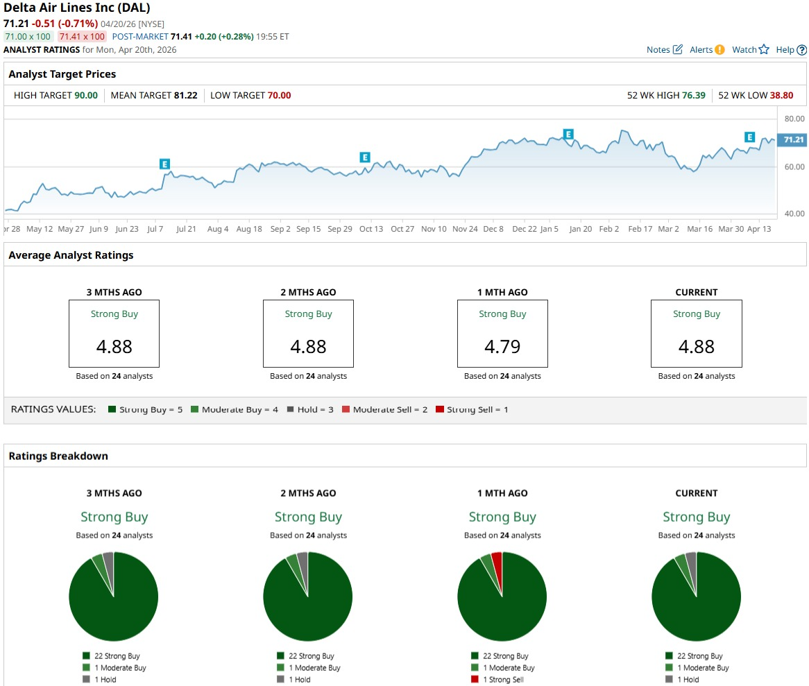 The broader analyst community is lining up behind that stance as well, as the consensus rating on Delta is still a “Strong Buy” based on 24 analyst views. The average 12‑month price target sits at $81.43, which implies roughly 19% potential upside from current levels.