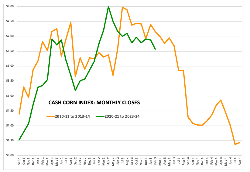 Where is the pressure coming from in new-crop corn? Again, for those who watch the market rather than USDA we know Dec23 corn spent the last 6 months buying acres away from Nov23 soybeans. The weekly close-only chart for the Nov23 soybean/Dec23 corn spread stayed below the 10-year average (favoring corn) from the first week of September through the last weekly close of February (last week). While I don’t believe in analogous years, the closest fit to what we saw with the 2023 edition was back in 2016 when US growers planted approximately 7% more corn acres and 1% more soybean acres. As always, weather will play a key role in what happens from here on out, but keep in mind what I talked about before with the 4-year pattern from 2010 through 2014 roughly repeating itself from 2020 through 2024.