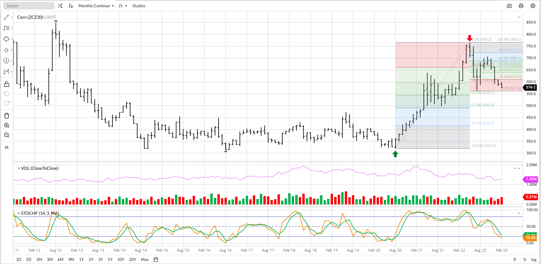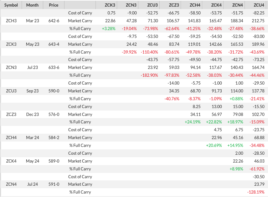 But what about corn? Those of you following along with Monthly Analysis on my website will recall both the cash and December futures markets reversed into major (long-term) downtrends last May. This was also true for the Teucrium CORN fund (CORN) if one likes to trade ETF’s rather than cash or futures. Most of the interest lately has been on Dec23 futures (ZCZ23), so let’s take a look at the Dec corn only continuous monthly chart. The 2022 edition posted a May high of $7.6625 before falling to a July low of $5.6175. This was Wave A (first wave) of the major 3-wave downtrend with Wave B (second wave) taking Dec22 back to a high of $7.0650. Wave C (third wave) began in November and included the roll from Dec22 to Dec23 during December. And as any Wave C should, the target was and has continued to be a move below the Wave A low of $5.6175. February has seen Dec23 trade down to $5.7425.