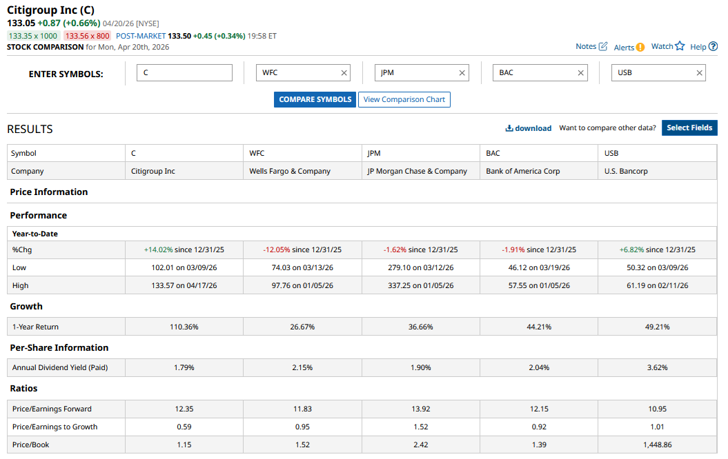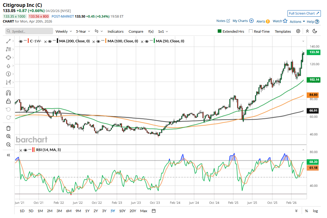 With a year-to-date (YTD) gain of 15%, Citigroup (C) is the best-performing major bank stock this year. The stock’s outperformance is not a 2026 thing; with gains of nearly 66% last year, it outperformed the broader markets and large bank peers by a good margin. The stock is up 87% over the last five years, while the Invesco KBW Bank ETF (KBWB) is up around 33%. Citi’s outperformance over the period could be attributable to the turnaround that CEO Jane Fraser has been leading since she took over the baton in March 2021. While “corporate turnarounds” is a much-abused term, Citi’s turnaround efforts are quite visible in its financials.