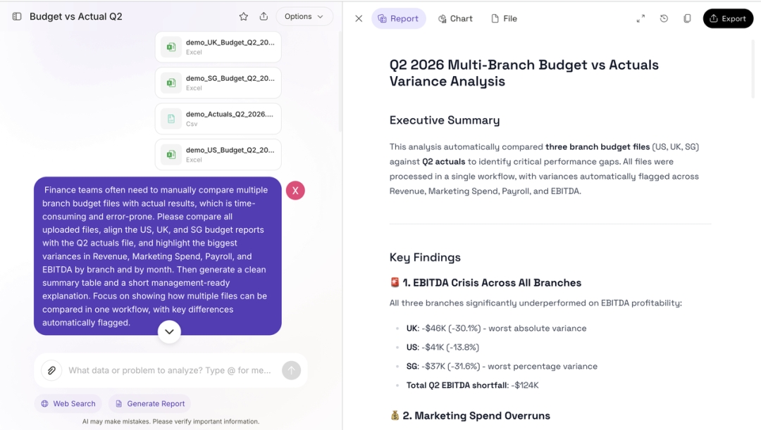 On paper, the workflow sounds simple: compare budget vs. actuals, identify the gaps, and summarize what changed. In reality, however, the work usually starts much earlier. Teams often need to pull numbers from multiple files, check versions, align categories, review supporting details, and determine which changes actually matter before they can even begin writing a summary.