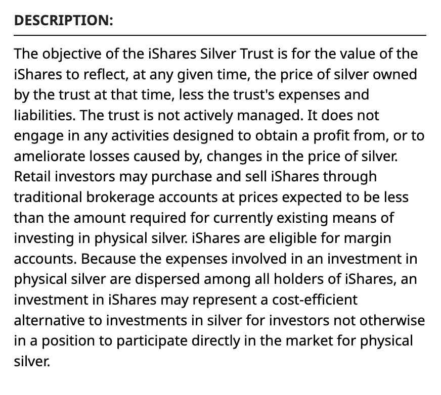 The fund summary for the iShares Silver Trust (SLV), the most liquid silver ETF product, states: