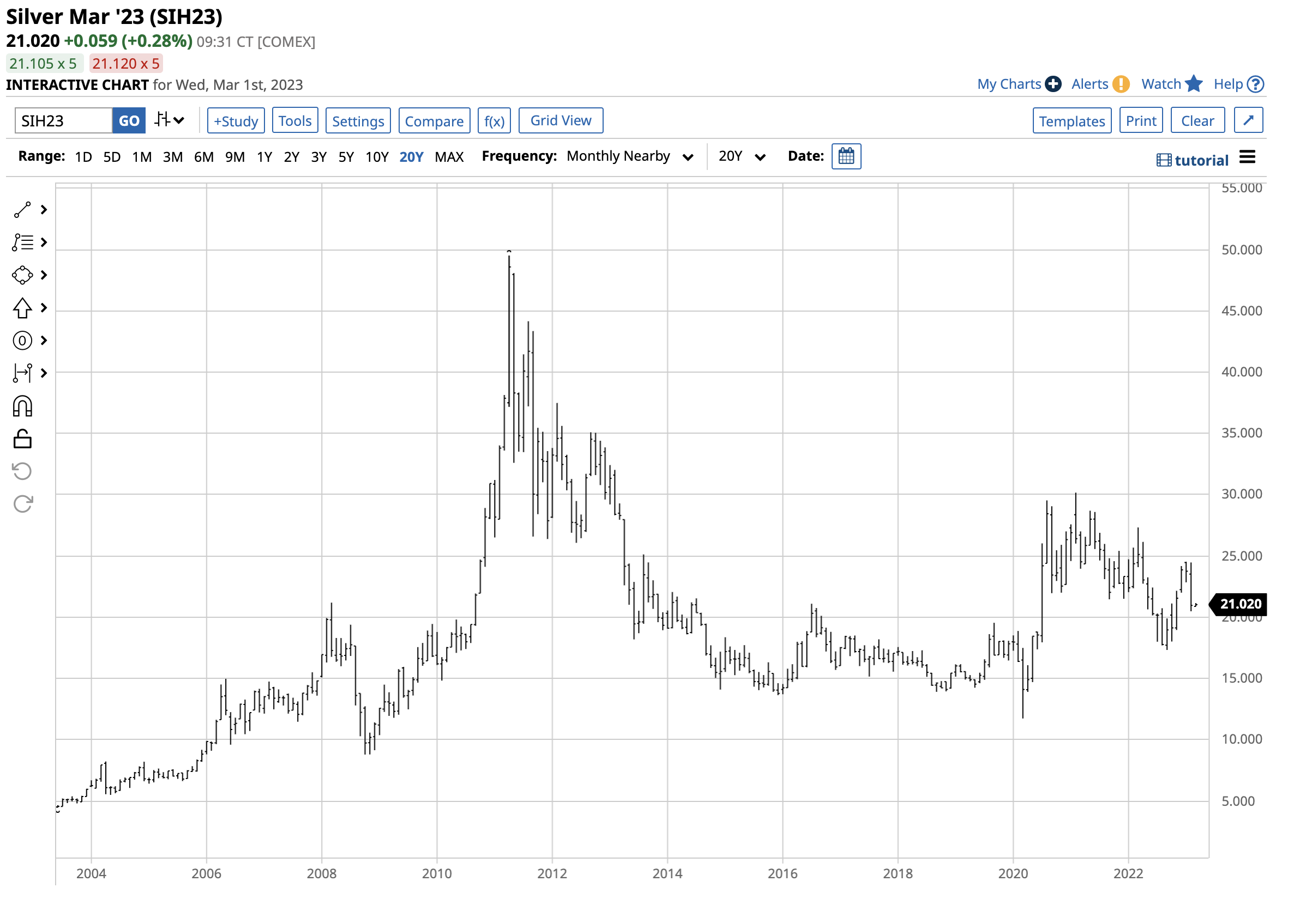 The chart shows silver futures were at the $21 per ounce level on March 1 as silver made new lows for 2023. Rising interest rates and a strong U.S. dollar have weighed on the precious metal.