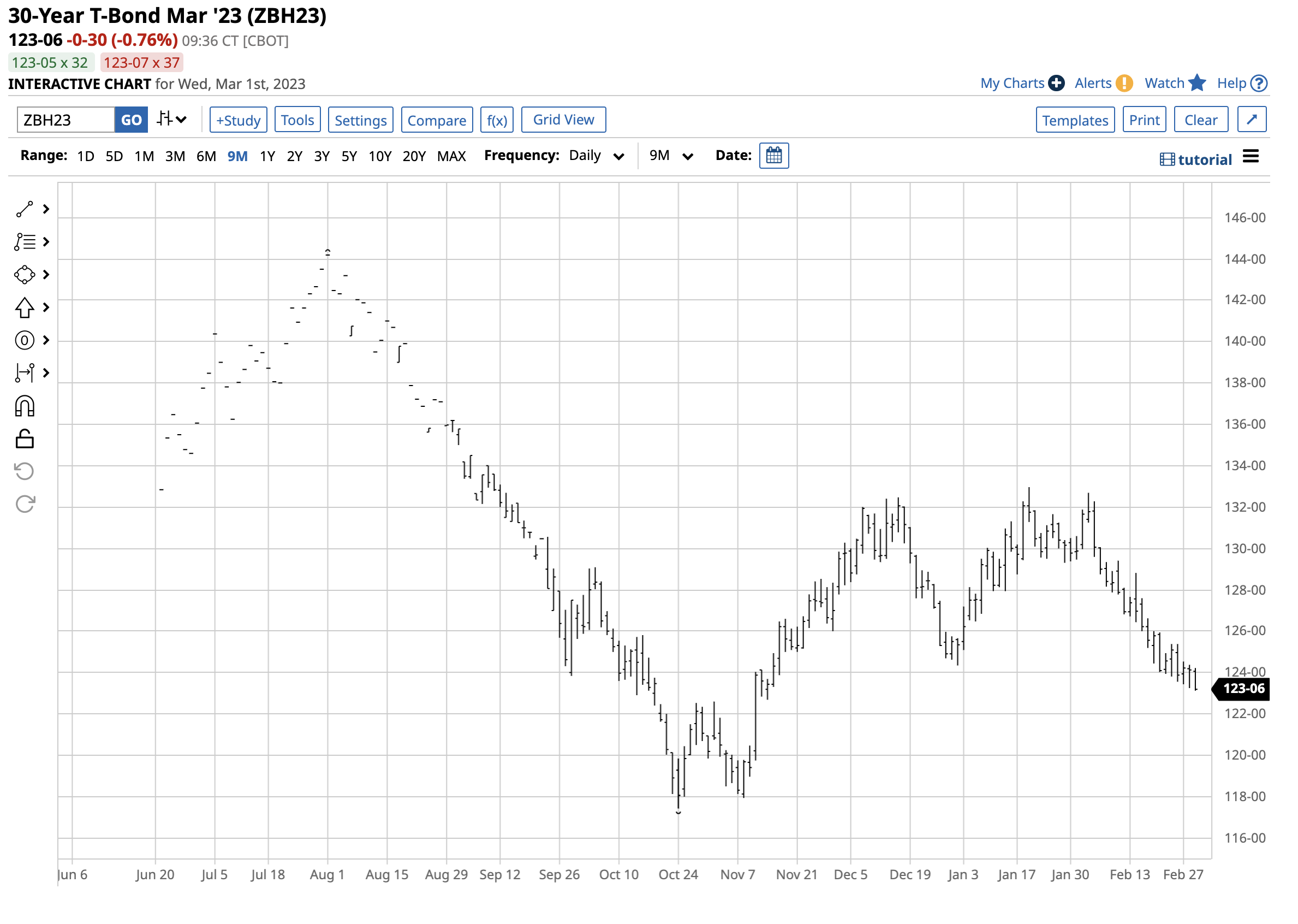 The chart of the nearby March U.S. 30-Year Treasury bond futures has been trending lower as the U.S. Federal Reserve continues its hawkish monetary policy path. The latest January CPI, PEC, and PPI reports that came in with higher inflationary pressures economists had expected set the stage for further rate hikes. Rising rates increase the cost of carrying silver inventories, weighing on the price.