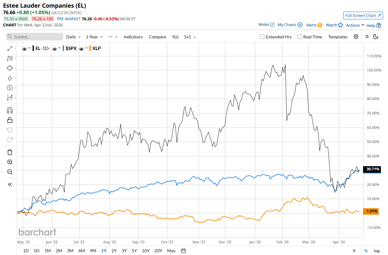 EL stock has surged 37% over the past 52 weeks, outperforming the S&P 500 Index’s ($SPX) 35% rise and the State Street Consumer Staples Select Sector SPDR ETF’s (XLP) marginal decline during the same time frame.