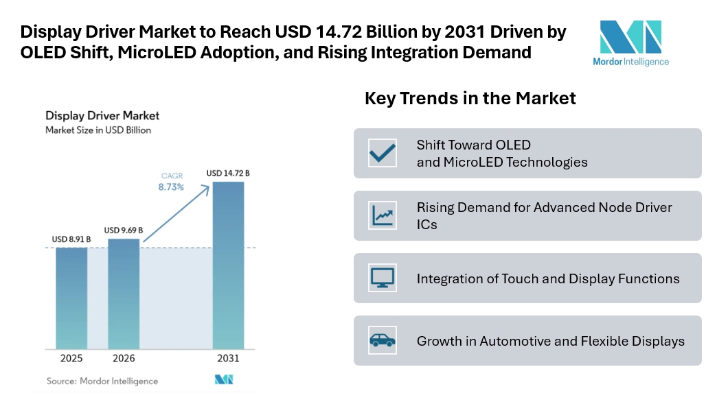 According to Mordor Intelligence, the display driver market size is estimated at USD 9.69 billion in 2026, growing from USD 8.91 billion in 2025, and is projected to reach USD 14.72 billion by 2031, expanding at a CAGR of 8.73% during the forecast period. This steady market growth reflects increasing demand for advanced display technologies across consumer electronics, automotive, and industrial applications.