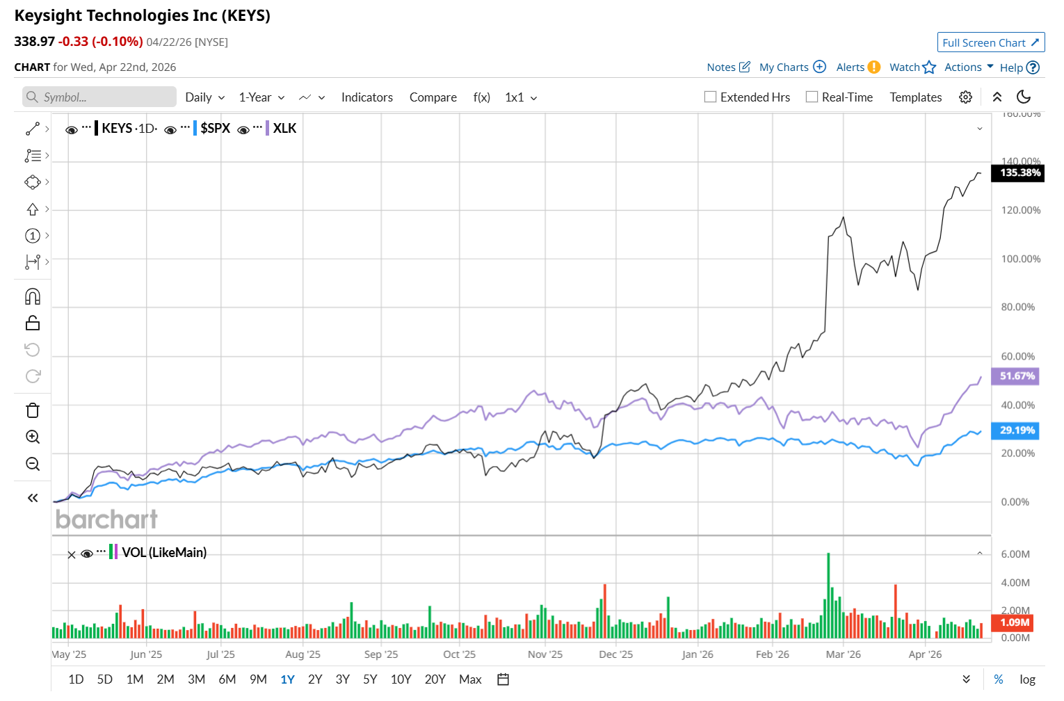 KEYS has skyrocketed 150.9% over the past 52 weeks, significantly outperforming both the S&P 500 Index's ($SPX) 35% return and the State Street Technology Select Sector SPDR ETF’s (XLK) 64.3% uptick over the same time period.