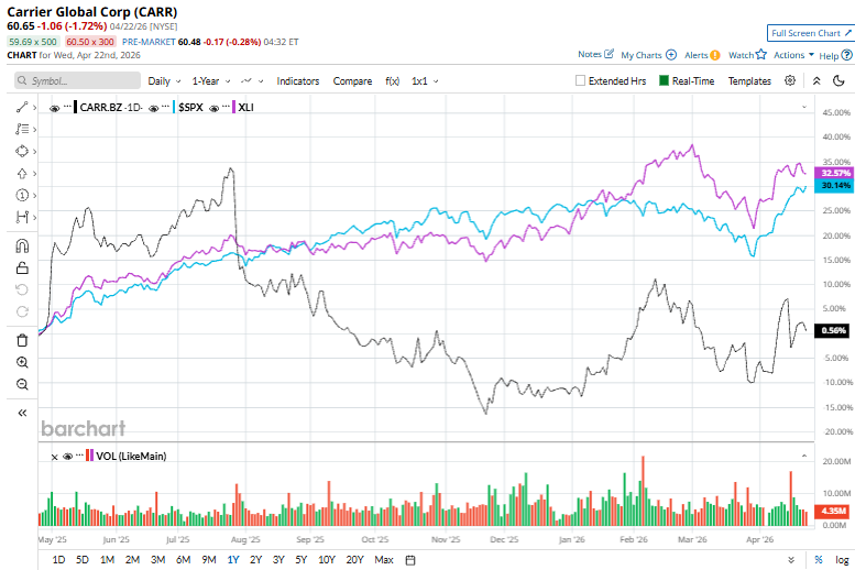 CARR stock has soared 2% over the past 52 weeks, underperforming the S&P 500 Index’s ($SPX) 35% rise and the State Street Industrial Select Sector SPDR ETF’s (XLI) 37.2% return during the same time frame.