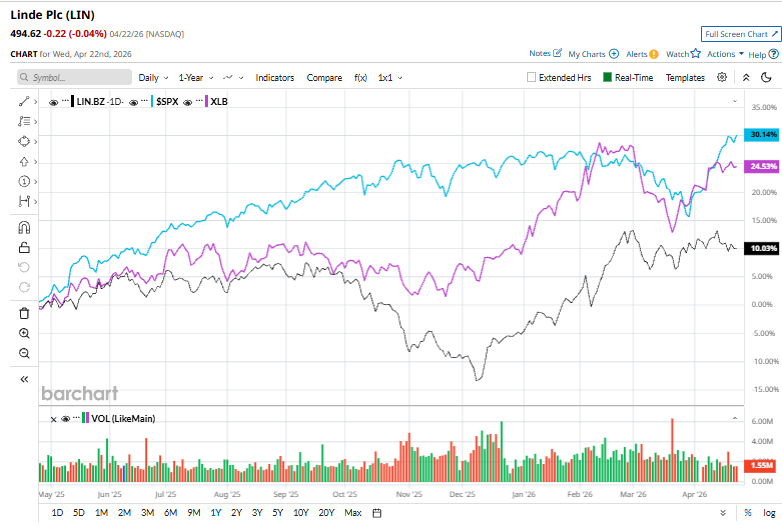 Linde shares have gained 8.8% over the past 52 weeks, underperforming the broader S&P 500 Index’s ($SPX) 35% return and the Materials Select Sector SPDR Fund’s (XLB) 27.4% increase over the same time frame.