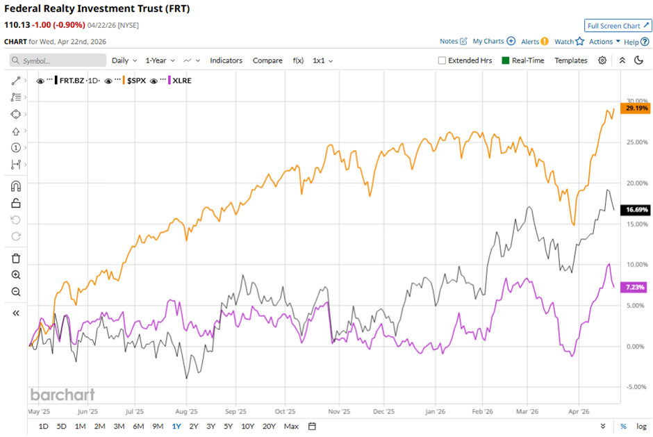 FRT stock has returned 17.7% over the past 52 weeks, underperforming the broader S&P 500 Index's ($SPX) nearly 35% gain. However, the stock has outpaced the State Street Real Estate Select Sector SPDR ETF's (XLRE) 7.5% rise over the same time frame.