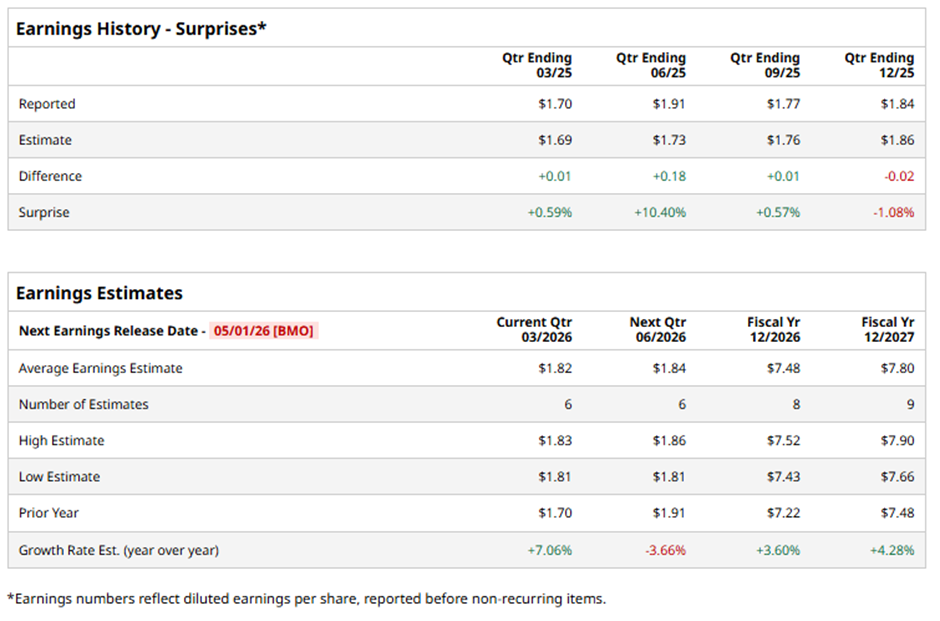 The Maryland, USA-based company is expected to release its fiscal Q1 2026 results before the market opens on Friday, May 1. Ahead of this event, analysts project FRT to report an FFO of $1.82 per share, a rise of 7.1% from $1.70 per share in the year-ago quarter. It has exceeded Wall Street's bottom-line estimates in three of the past four quarters while missing on another occasion.