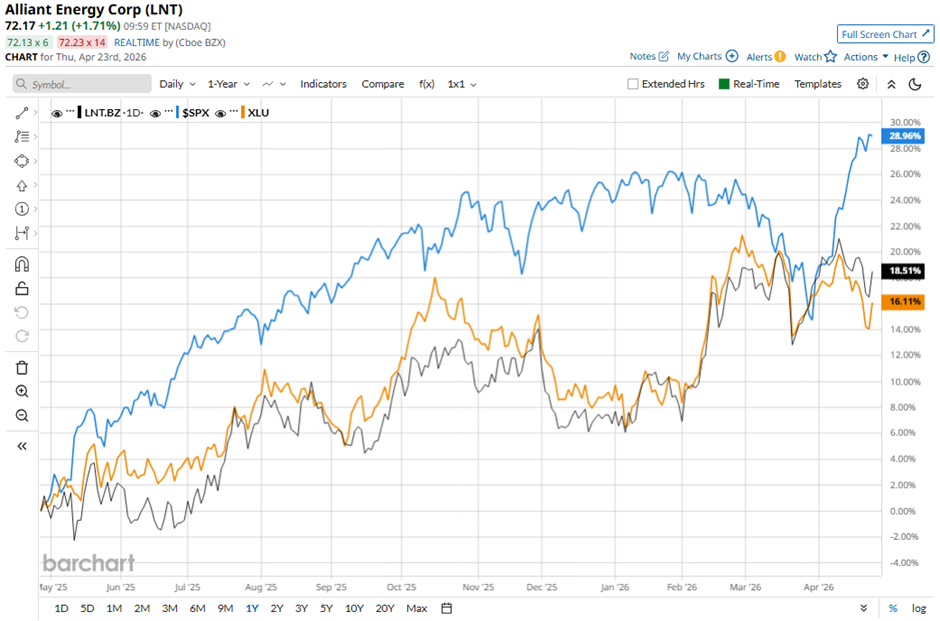 LNT stock has risen 17.5% over the past 52 weeks, underperforming the S&P 500 Index's ($SPX) 32.4% gain. However, the stock has outpaced the State Street Utilities Select Sector SPDR ETF's (XLU) 16.2% increase over the same period.