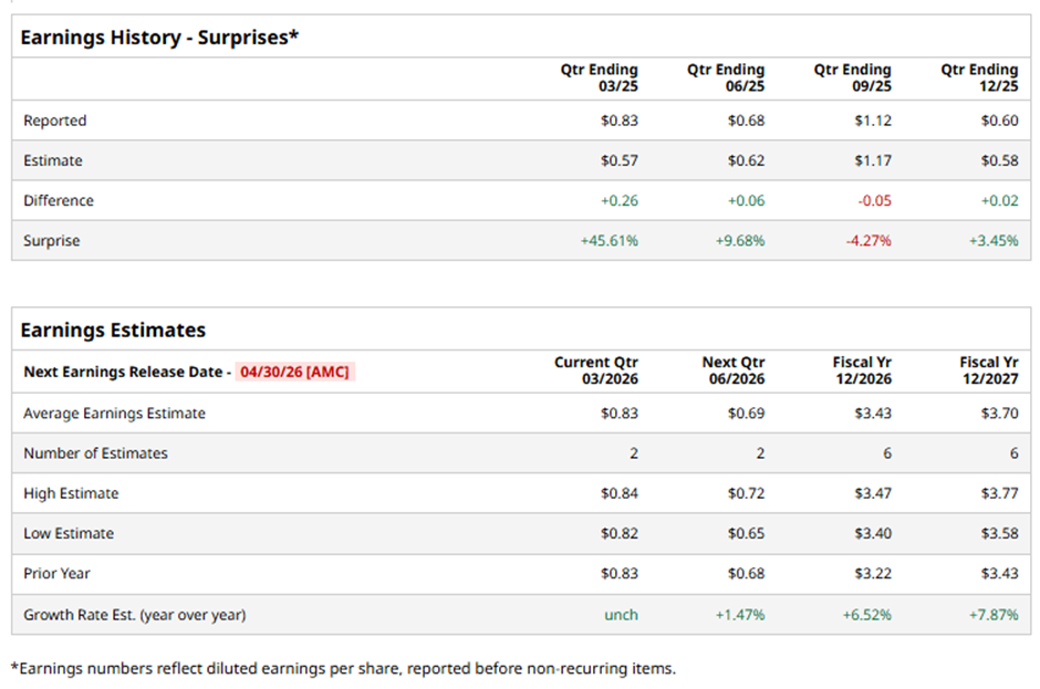 The Madison, Wisconsin-based company is expected to unveil its fiscal Q1 2026 results after the market closes on Thursday, Apr. 30. Before the event, analysts anticipate Alliant Energy to report an adjusted EPS of $0.83, in line with the same quarter last year. It has surpassed Wall Street's bottom-line estimates in three of the past four quarters while missing on another occasion.