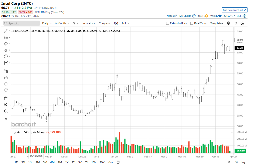 Despite these near-term headwinds, Intel’s stock has been one of the market’s most remarkable performers, surging 225% over the past 12 months and 81.4% year-to-date, recently touching an all-time high of $70.32.