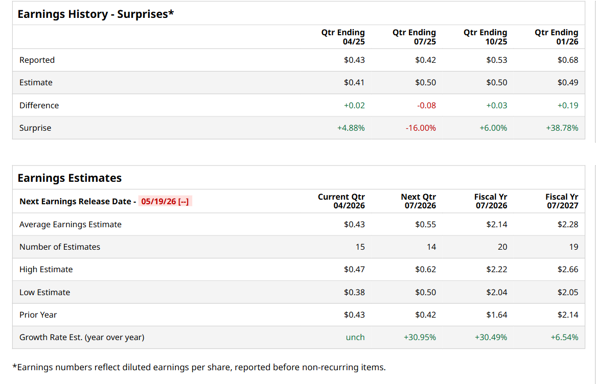 Santa Clara, California-based Palo Alto Networks, Inc. (PANW) is a cybersecurity company that provides advanced, AI-powered security solutions for enterprises, service providers, and government entities. Valued at a market cap of $147.9 billion, the company is scheduled to announce its fiscal Q3 earnings for 2026 in the near future.
