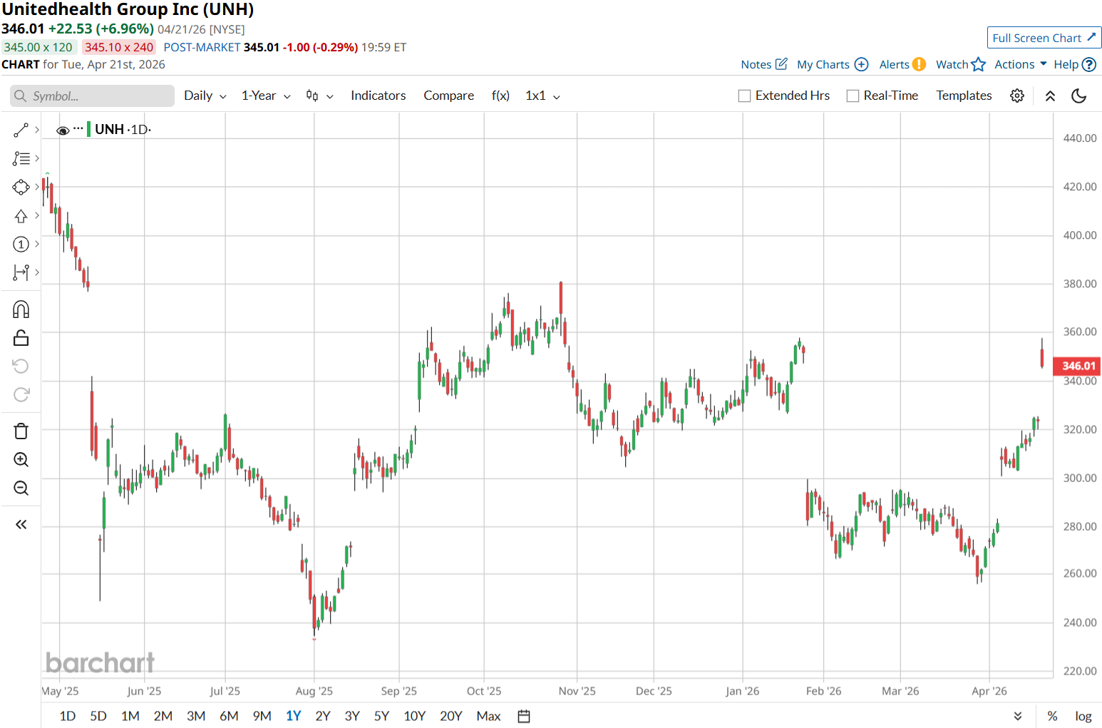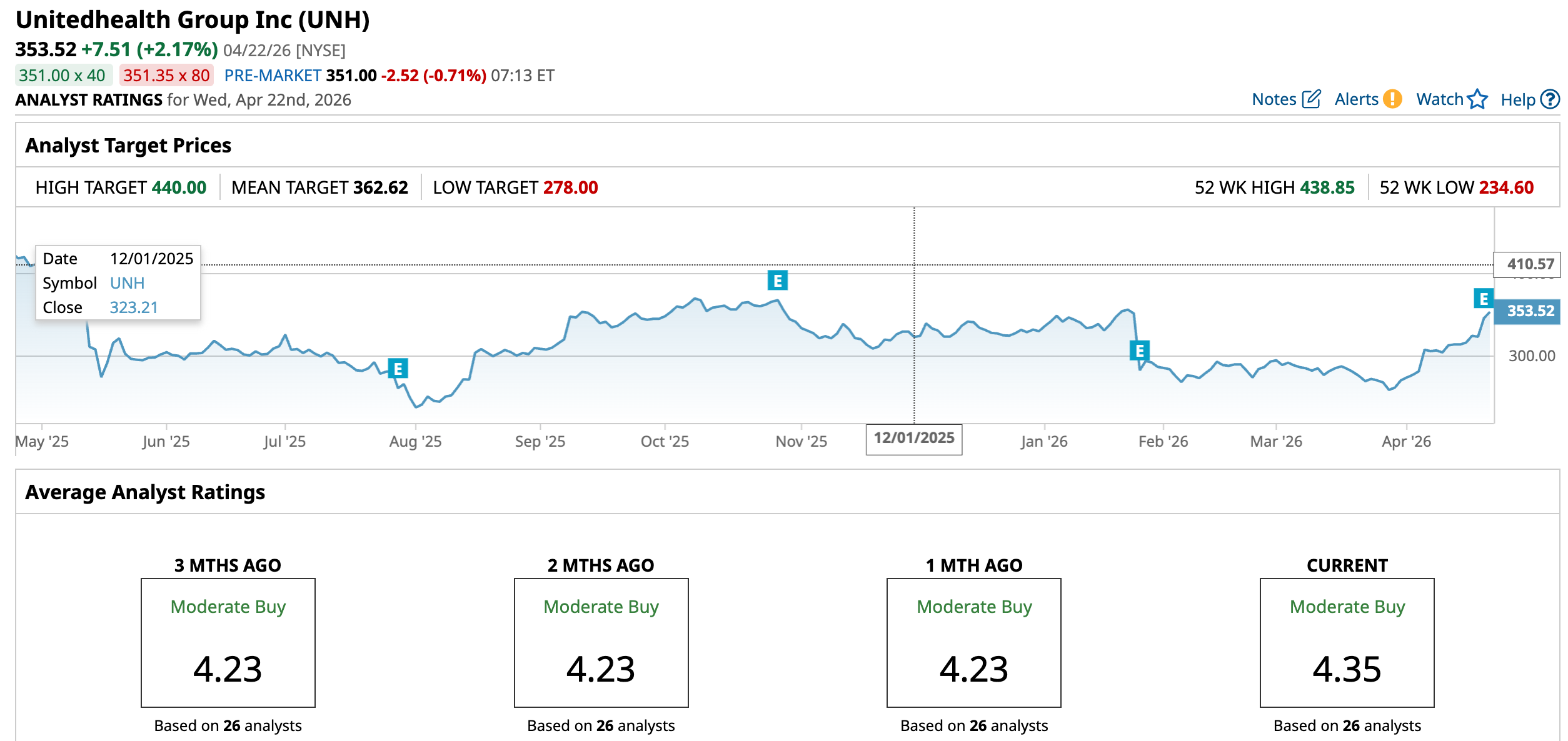 The stock then spent months trying to find a bottom. By late March, UNH was still down 18% year-to-date, trading well below key moving averages, while analysts cut Q1 estimates as high medical costs kept weighing on sentiment.