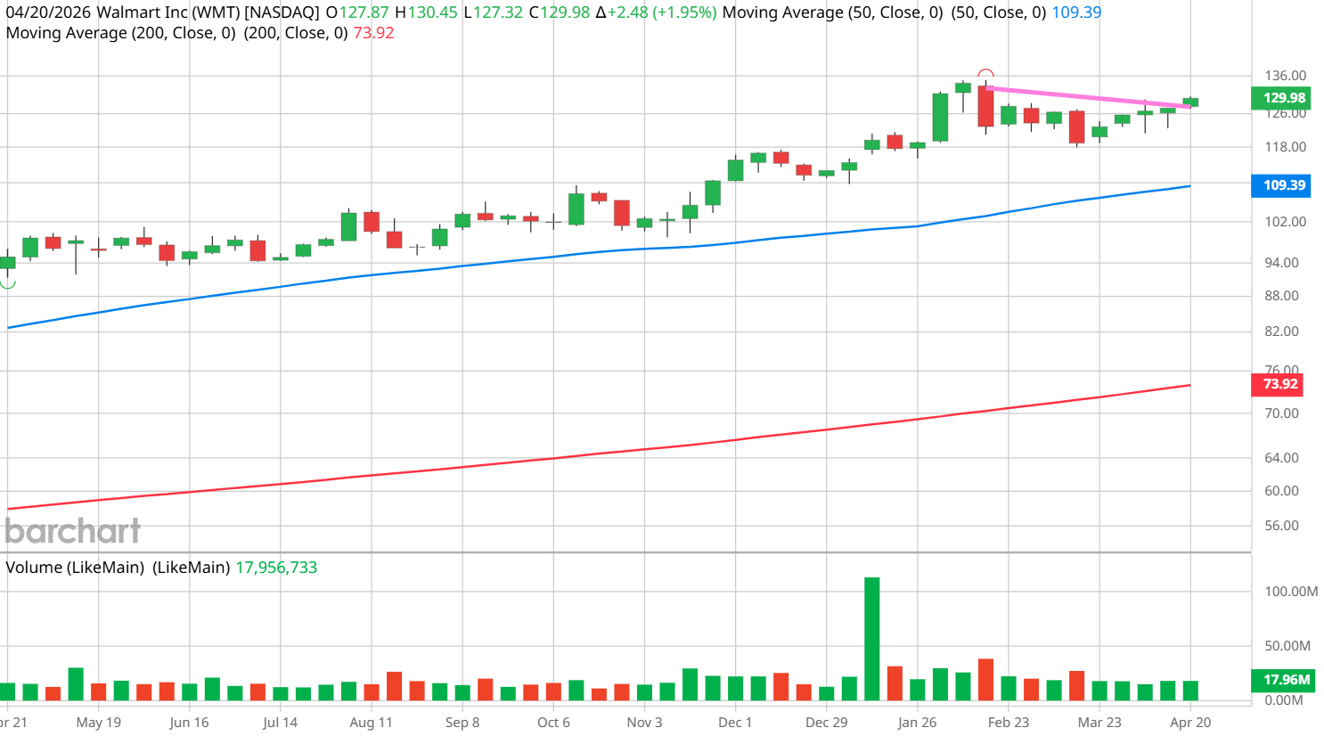 In other words, when we look at the frequency of weekly candlesticks, we would assume that the return profile of Walmart stock is in an uptrend. But the opposite is true: WMT is actually in a downtrend, which creates an unusual contrarian vibe.