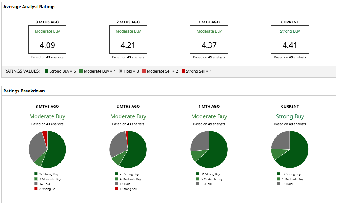 The consensus rating for NFLX stock from 49 analysts is a “Strong Buy,” but, interestingly, the resolve has hardened over the last few weeks. Just three months ago, 27 of 43 analysts had “Buy” ratings, but 14 suggested holding and two urged investors to sell. But now 37 of 49 analysts have “Buy” ratings while nobody suggests selling, and 12 are holding fast.