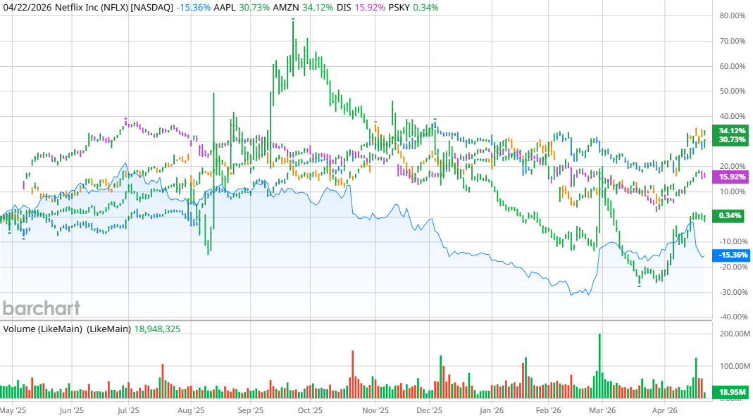 Shares have been a disappointment in recent weeks, however, with a drop throughout the first part of the year pushing Netflix shares to a 5% loss—a return that’s worse than all of its more diversified competitors.
