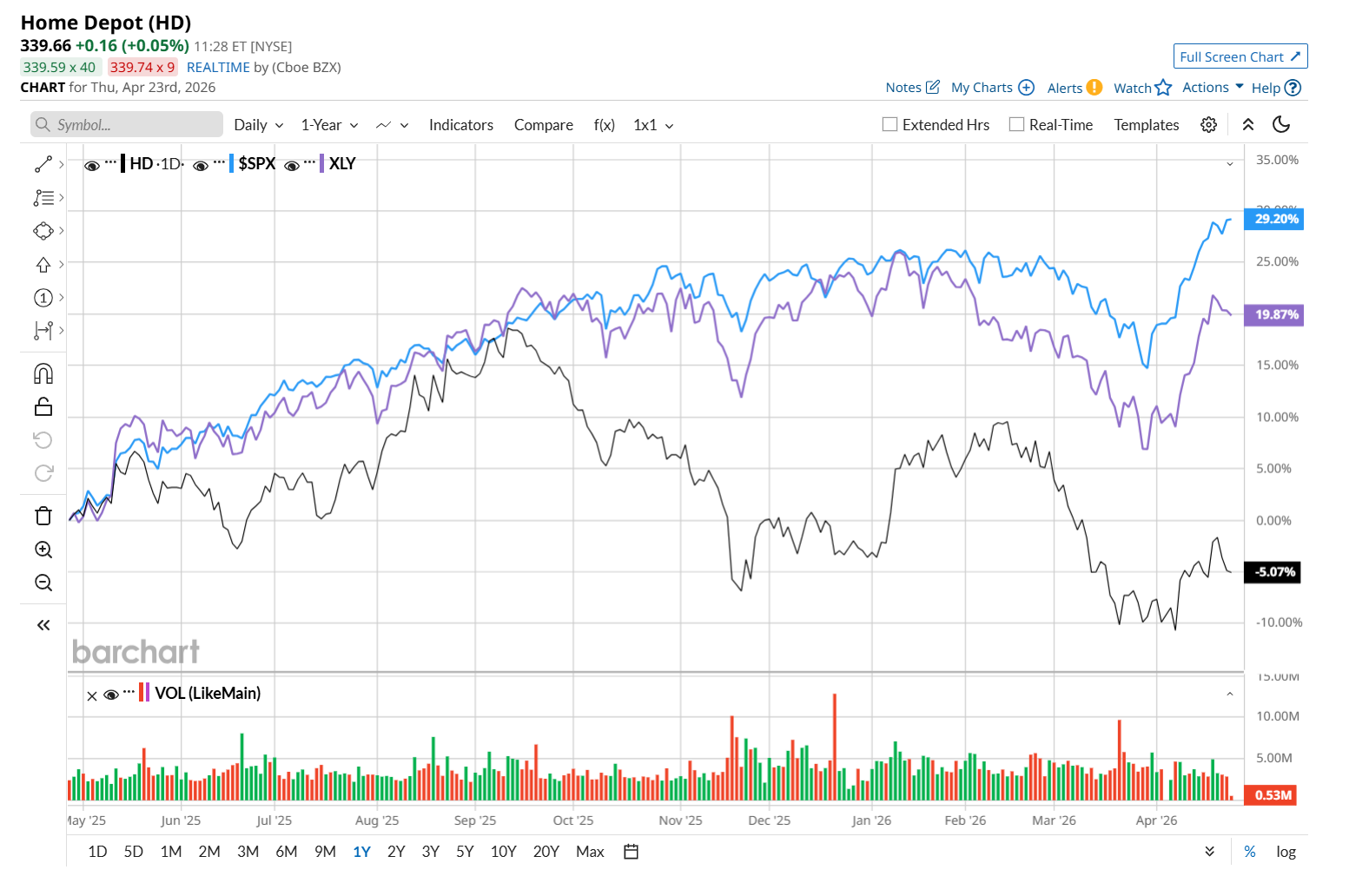 HD has declined 4.7% over the past 52 weeks, notably trailing both the S&P 500 Index's ($SPX) 35% return and the State Street Consumer Discretionary Select Sector SPDR ETF’s (XLY) 24.4% uptick over the same time period.