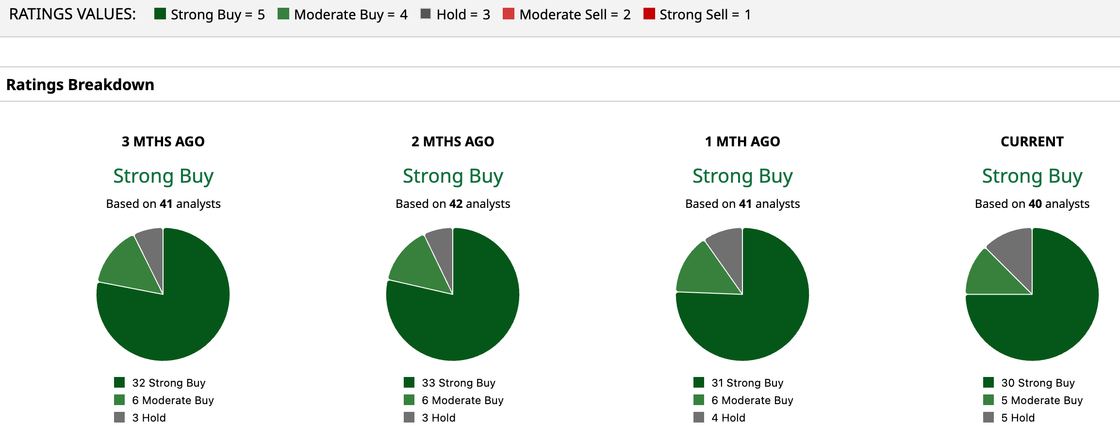 Currently, Wall Street has assigned MU stock an overall rating of “Strong Buy.” Among 40 analysts covering the stock, 30 rate it a “Strong Buy,” five have issued a “Moderate Buy,” while five recommend “Hold.”