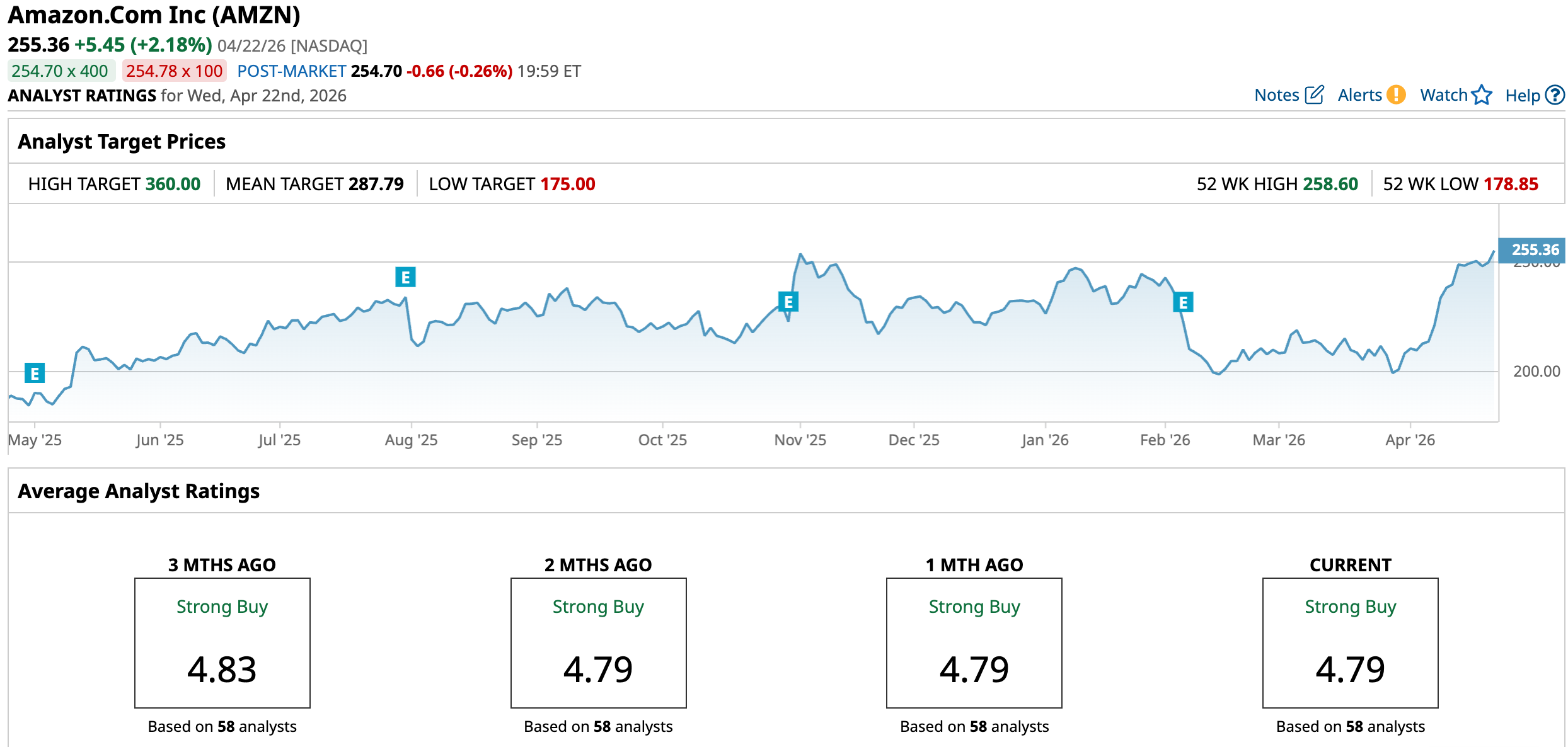 That bullishness is not isolated to one desk, as consensus from 58 covering analysts lands squarely in “Strong Buy” territory. The average 12‑month price target across this group stands at $287.79, roughly 12.7% upside from here. Even after a solid run, the Street still sees room for double‑digit gains if AWS keeps cashing in on AI demand and those stronger cash flows continue to build.