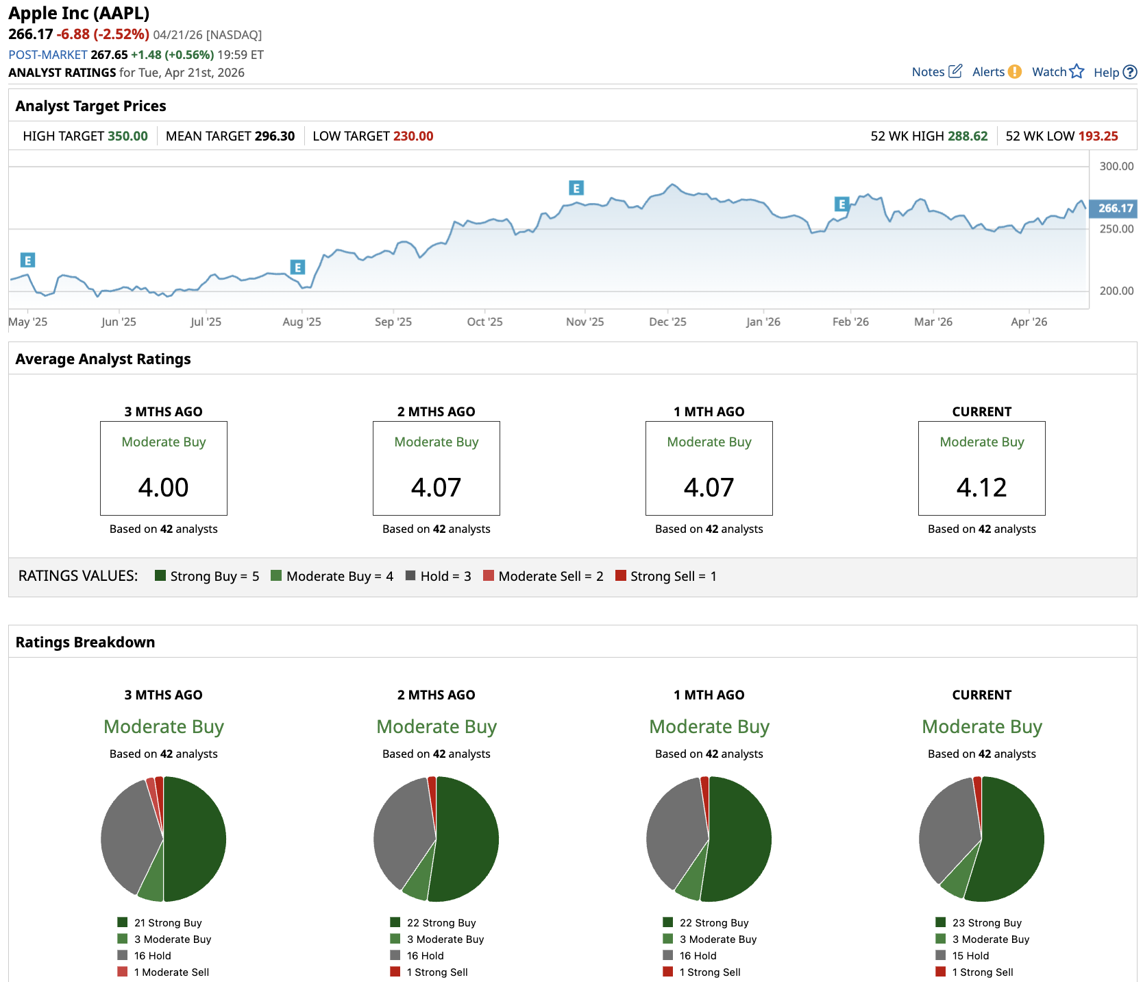 Out of the 42 analysts covering Apple stock, 23 recommend a “Strong Buy,” three recommend a “Moderate Buy” rating, 15 recommend a “Hold,” and one recommends a “Strong Sell” rating. The average AAPL stock price target is $296.30, implying potential upside of 8% from current levels.