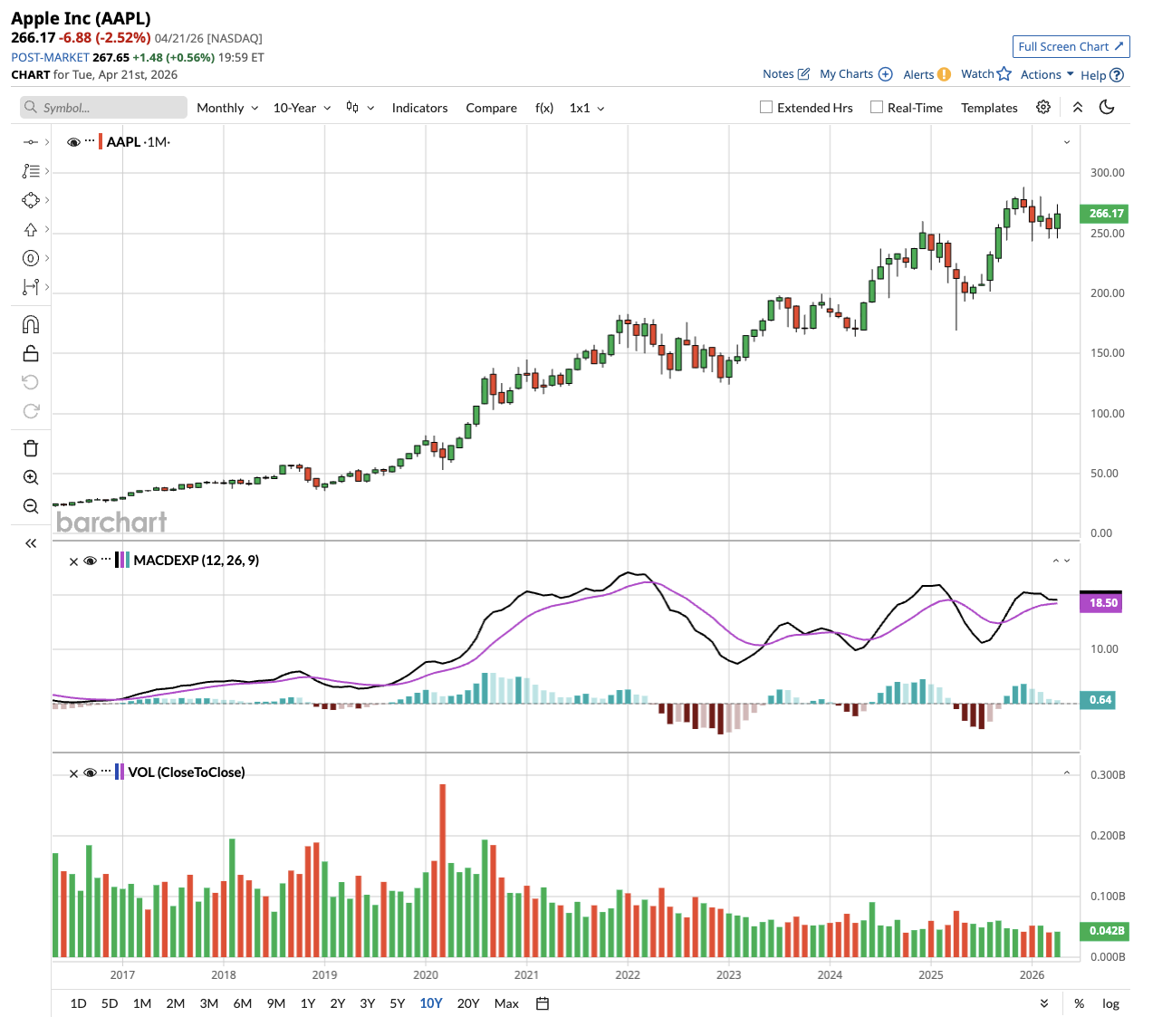 Over the past 15 years, Apple has delivered a return of more than 1,100%, comfortably outpacing the S&P 500 ($SPX) and Nasdaq indices. Revenue nearly quadrupled during Cook’s tenure, climbing past $400 billion in the most recent fiscal year. Cook achieved record results driven by operational discipline and a relentless push into services. Services revenue rose 14% year-over-year (YOY) to $109.2 billion in fiscal 2025, accounting for 26% of total sales. The high-margin Services business enables Apple to consistently report gross margins above 48%.