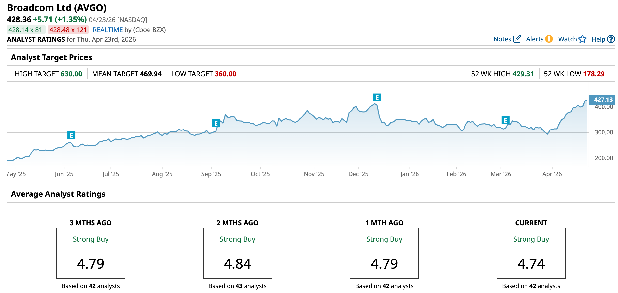Shares have surged 142.4% over the past year, sharply outpacing the S&P 500 Index ($SPX), which gained 32.8% over the same period. The momentum has only accelerated more recently, with Broadcom up 33% in the past month alone, compared to a 8.5% rise in the broader market. Even after touching a record high of $423.20, the stock brought a new high on April 23 of $429.31, a sign that much of the recent momentum continues.