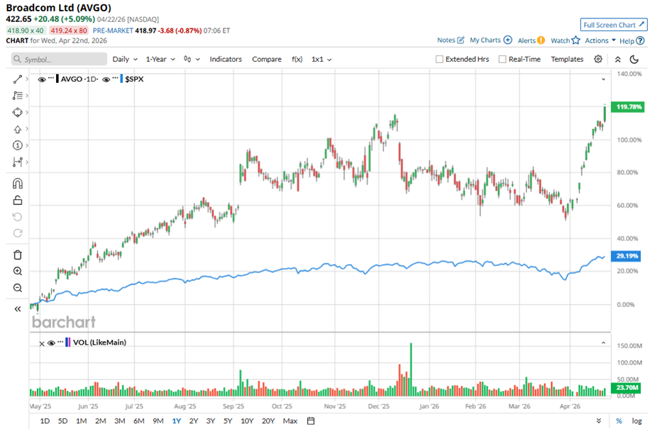 Shares of fabless chip and software maker Broadcom (AVGO) rallied more than 5% on April 22 to touch a record high of $423.20, as a fresh wave of deal-driven momentum met a broader upswing in semiconductor stocks. The move followed news of an expanded collaboration with Alphabet's Google Cloud (GOOG) (GOOGL), putting Broadcom firmly back in the spotlight as investor appetite for artificial intelligence (AI) infrastructure plays continues to build.