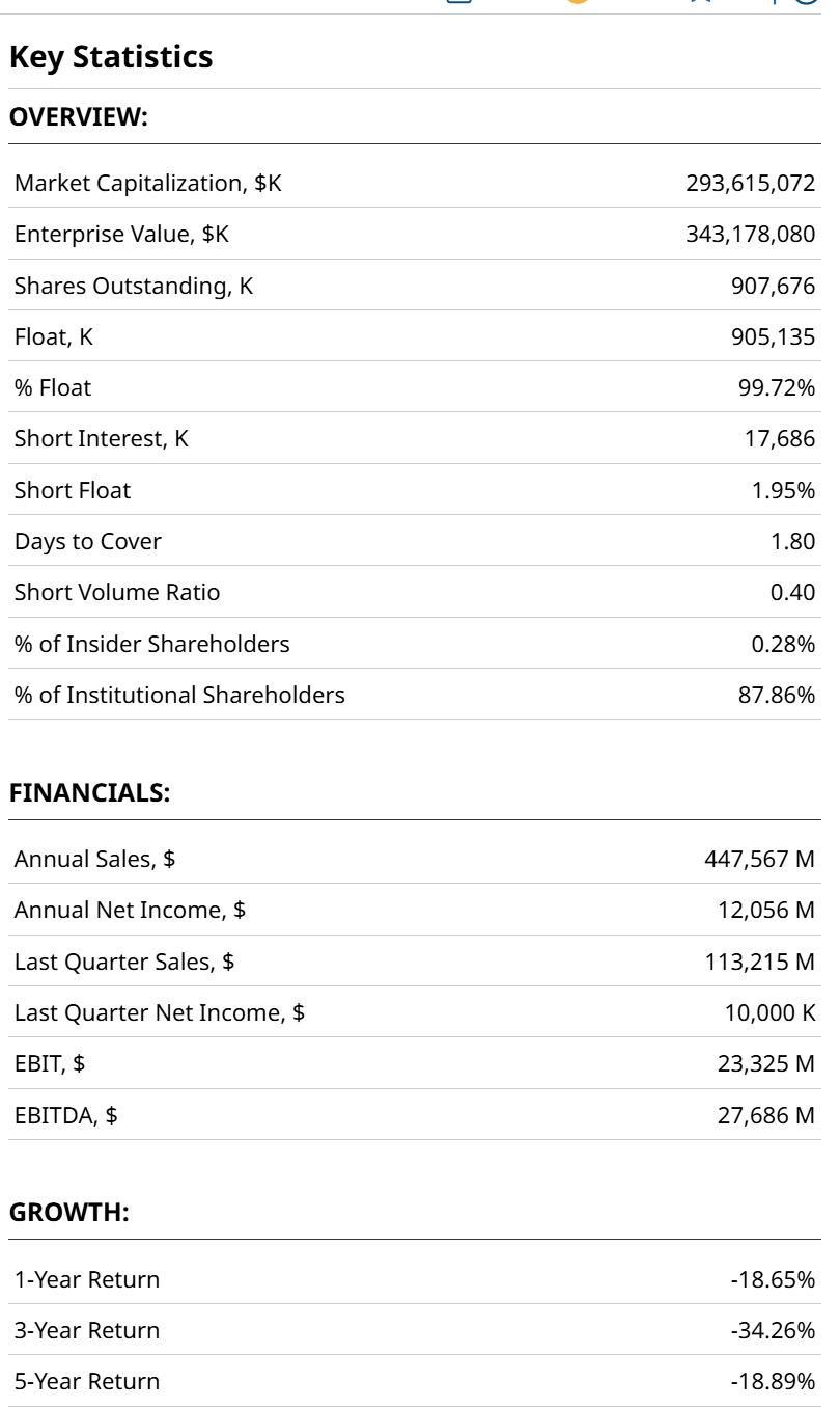 Shown below, the stock is a big-cap with a big problem, still. That one-day move does not reconcile the fact that the stock has still lost about a third of its value over the past three years. That’s a time during which the broad market soared.