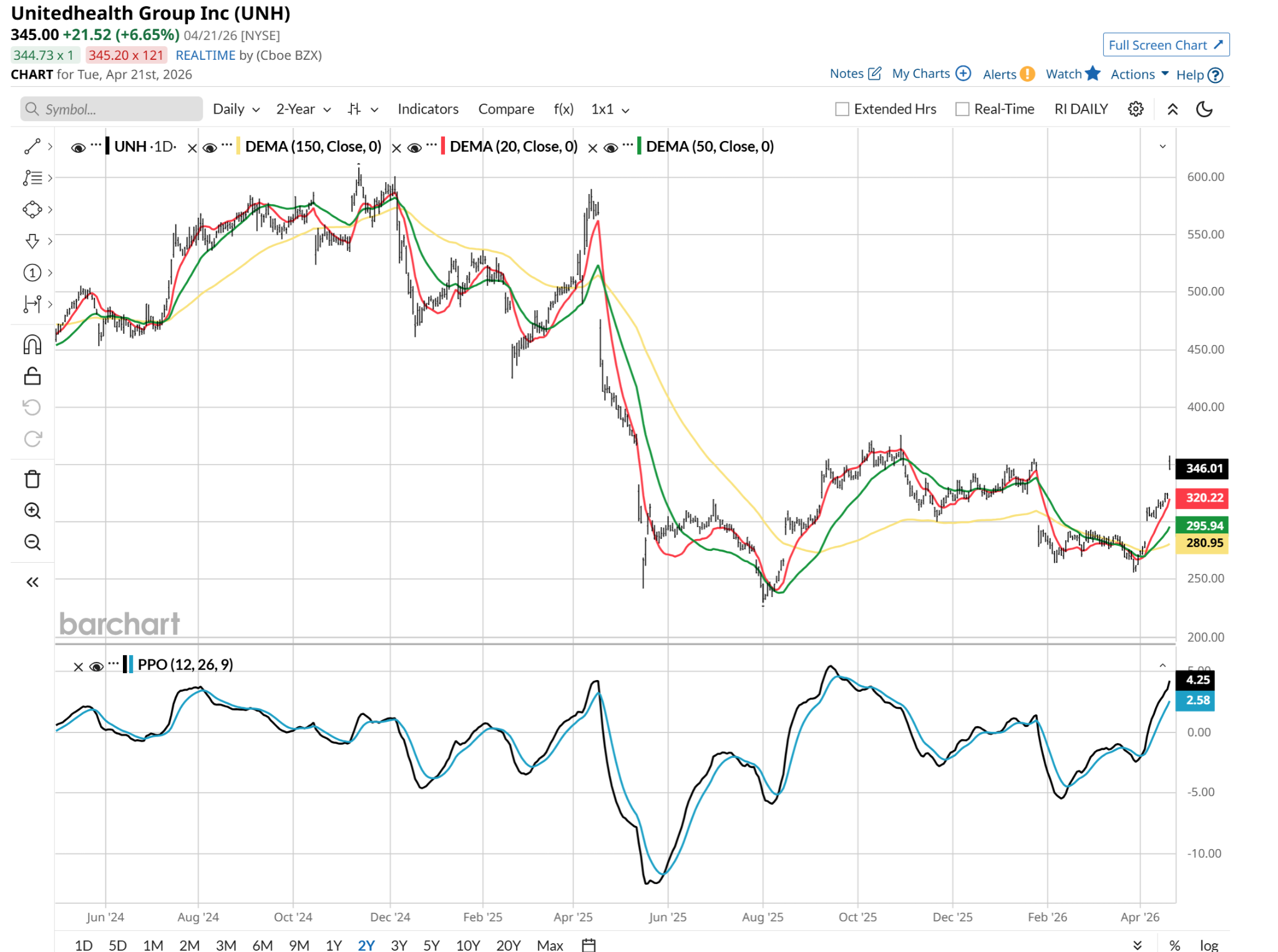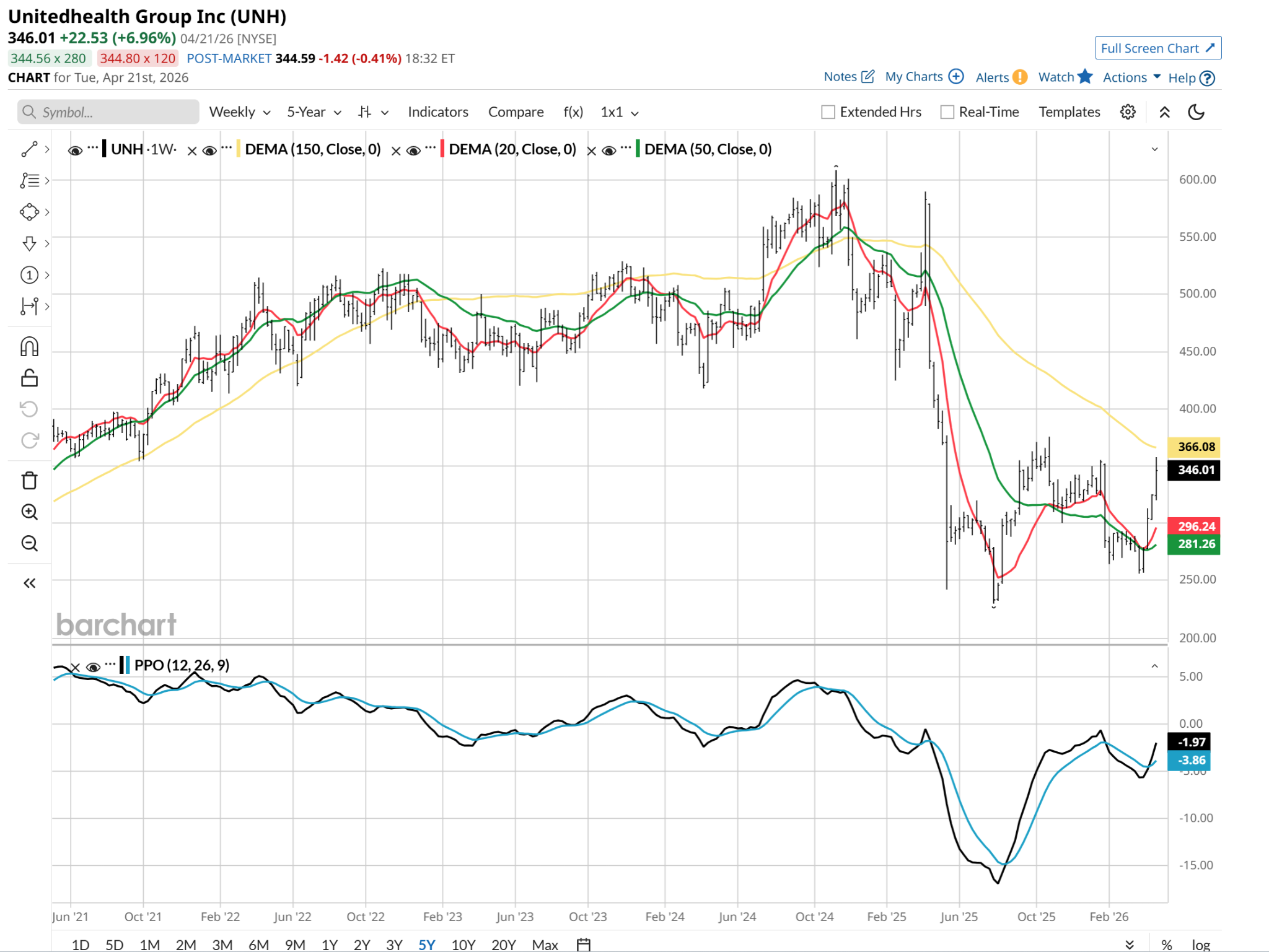 The technical picture is not only the one I focus on the most. In the case of this stock, it is the most encouraging to me. It comes with plenty of risk of a relapse, but this daily view shows UNH stock approaching a fairly critical resistance level ($350 to $355) with some momentum.