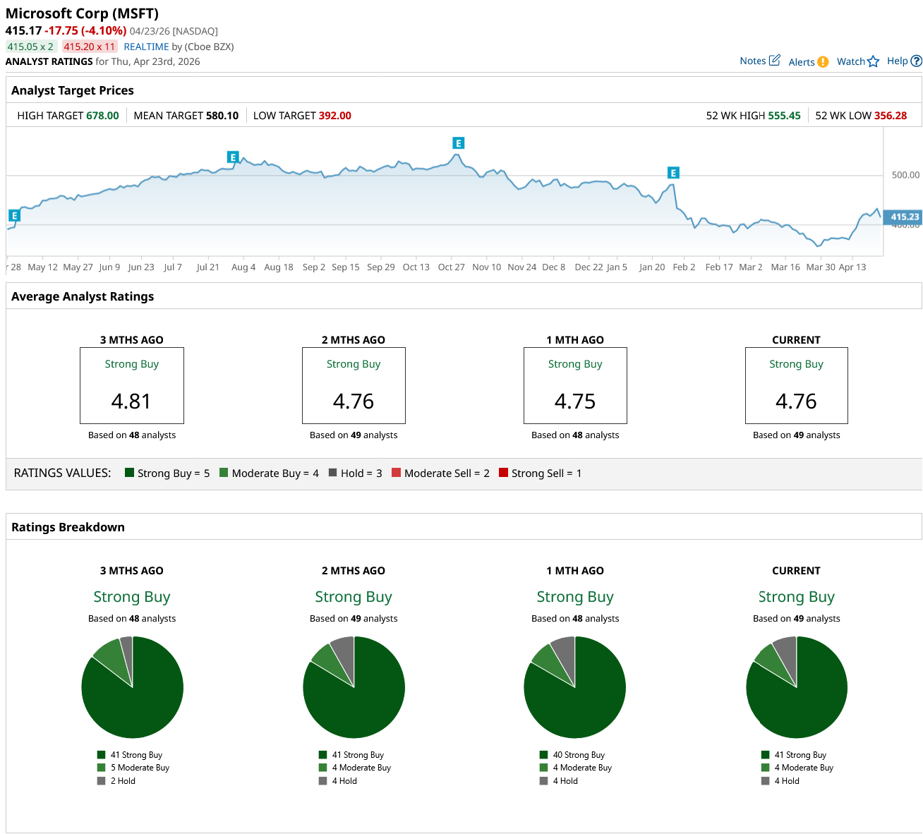 Overall, MSFT stock holds a consensus “Strong Buy” rating on Wall Street. Of the 49 analysts covering the stock, 41 rate it a “Strong Buy,” four say it is a “Moderate Buy,” and four recommend a “Hold.” The average target price of $580.10 suggests MSFT stock could climb by 40% from current levels. Plus, its high price estimate of $678 implies an upside potential of 63% over the next year.