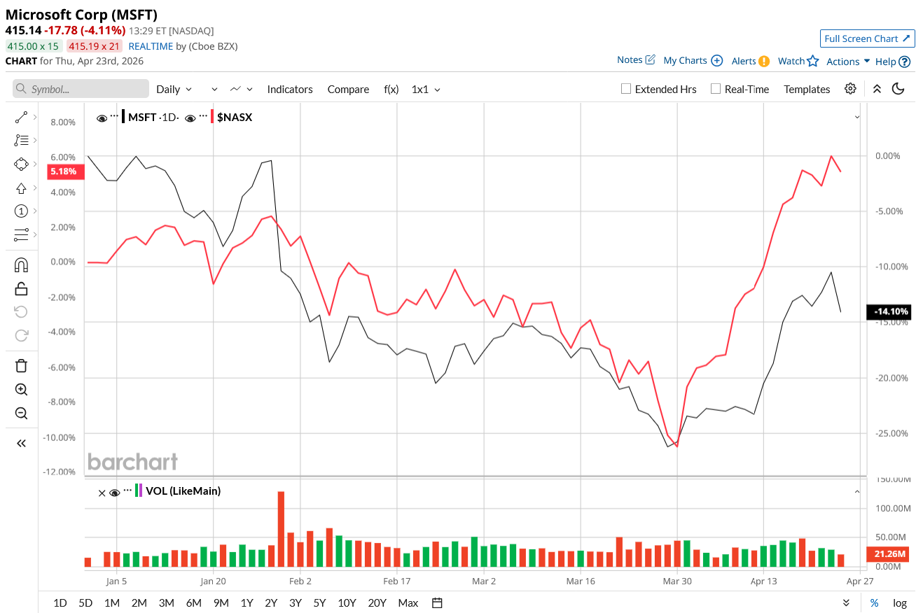 Like most tech stocks this year, Microsoft's stock hasn’t been immune to the shift in the market sentiment. The stock is down 14% year-to-date (YTD), compared to the tech-heavy Nasdaq Composite ($NASX) gain of 6%, but its fundamentals remain rock solid. Led by artificial intelligence (AI), its cloud business continues to scale at an impressive pace, and the tech titan shows no sign of slowing.