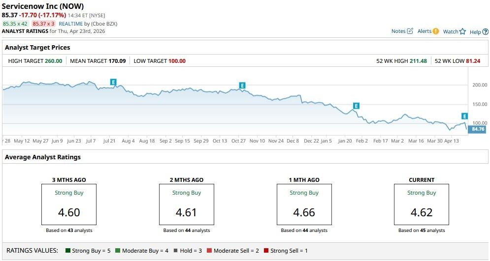 The consensus rating on NOW stock remains at “Strong Buy,” with the mean price target of about $170 indicating potential for a 100% rally from here.
