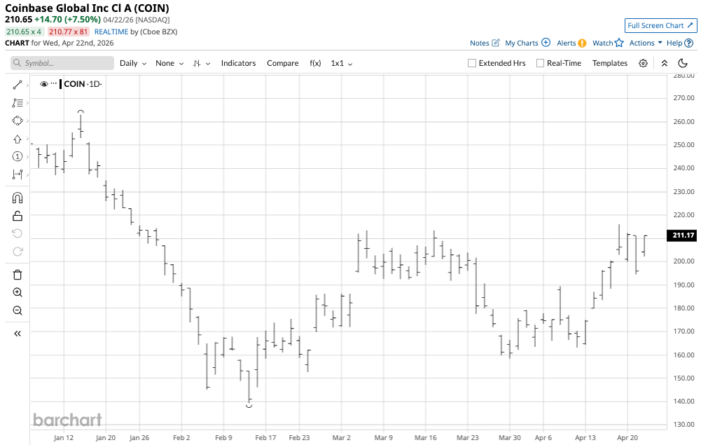 The daily chart shows the decline and the subsequent price consolidation between $152.70 and $213.50 from February 24 through April 16, 2026. On April 17, COIN eclipsed the $213.50 level and set a new high of over $216 per share on Friday, April 17. From a short-term perspective, COIN has also been making higher lows and higher highs and has broken out above the top side of the consolidation range, suggesting that further gains could be on the horizon.Â