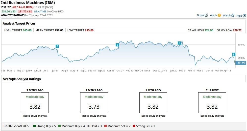 The consensus rating on IBM stock remains at a “Moderate Buy” with the mean price target of about $299, indicating potential upside of roughly 30% from here.
