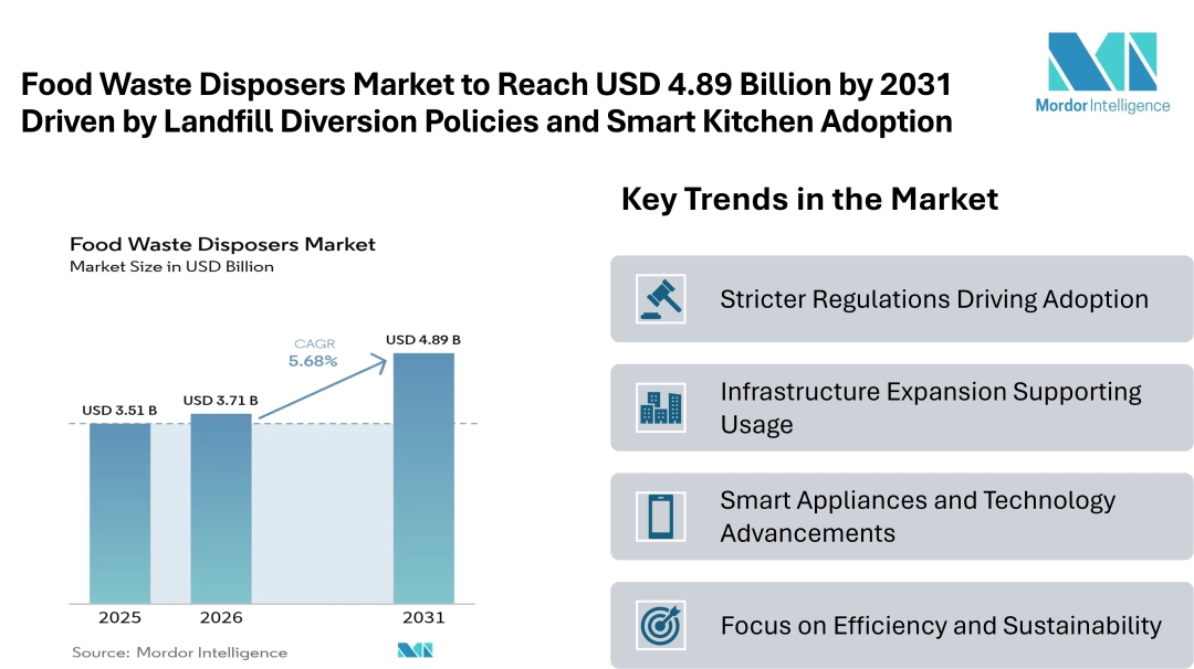According to Mordor Intelligence, the food waste disposers market size is estimated at USD 3.71 billion in 2026, increasing from USD 3.51 billion in 2025 and projected to reach USD 4.89 billion by 2031, growing at a CAGR of 5.68%. This steady market growth reflects rising awareness around waste management and the need to reduce landfill dependency across residential and commercial sectors.